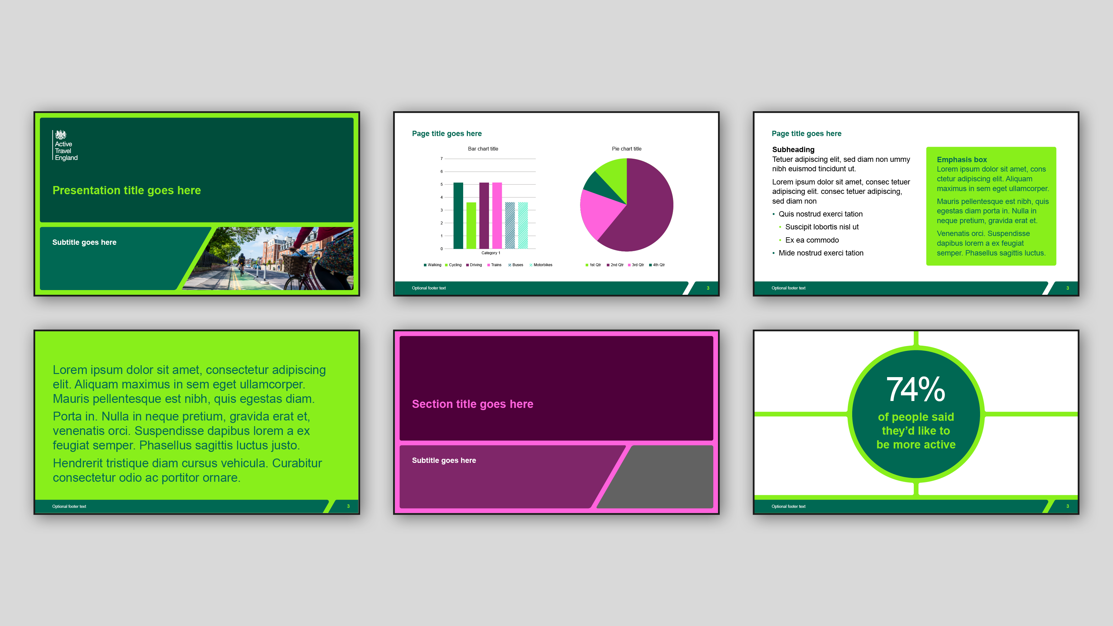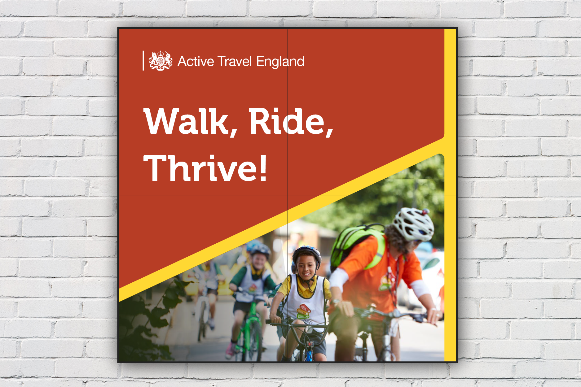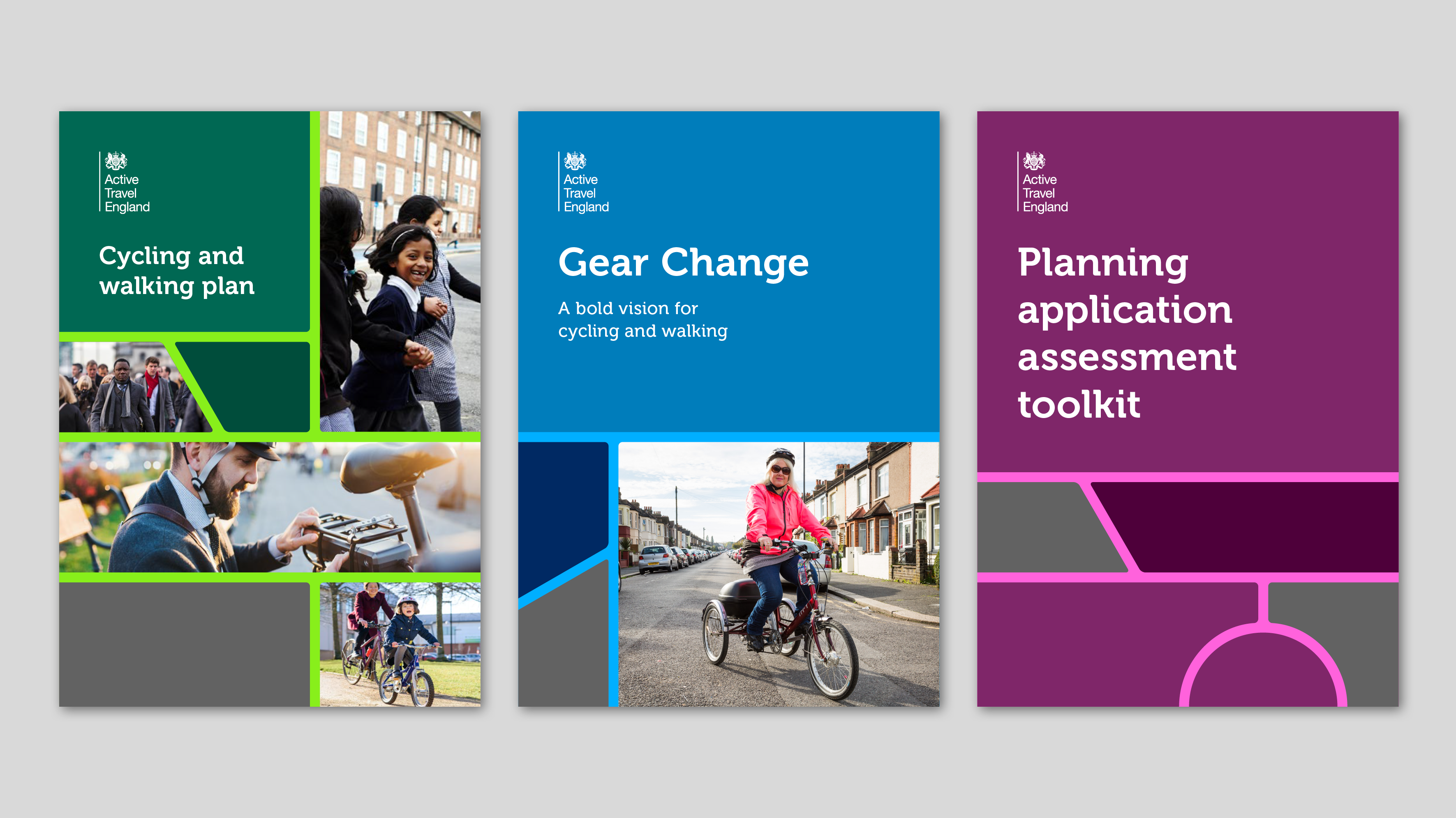 Active Travel England is an agency set up by the government to increase the number of local journeys being walked, wheeled or cycled. They asked us to create a vibrant brand identity, using their existing government style logo and the DfT colour palette, that would show active travel in a positive light, while also being practical and easy to use.