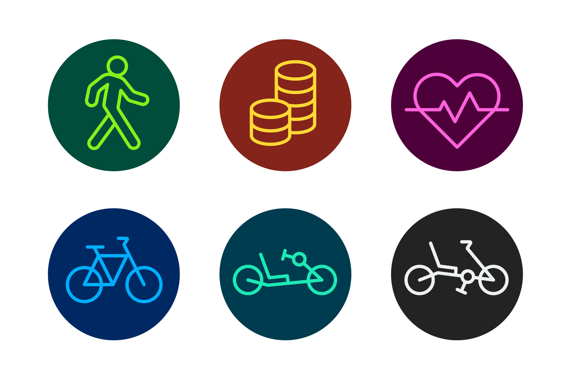 I devised a modular graphic system inspired by city grids. The interconnecting paths and roads are in bright and energetic colours, indicating the joy of active travel, as well as having an urban feel to them. A neon version of each of DfT’s existing colours were added to the brand palette. All the paths are connected, reflecting Active Travel England’s key aim of continuous and connected routes. The icon style follows this same design logic. The modular system means there is lots of opportunity for variety in layouts, whether using one image, multiple images or a graphic only approach. We created a full set of guidelines for the new brand, as well as a variety of assets and templates.