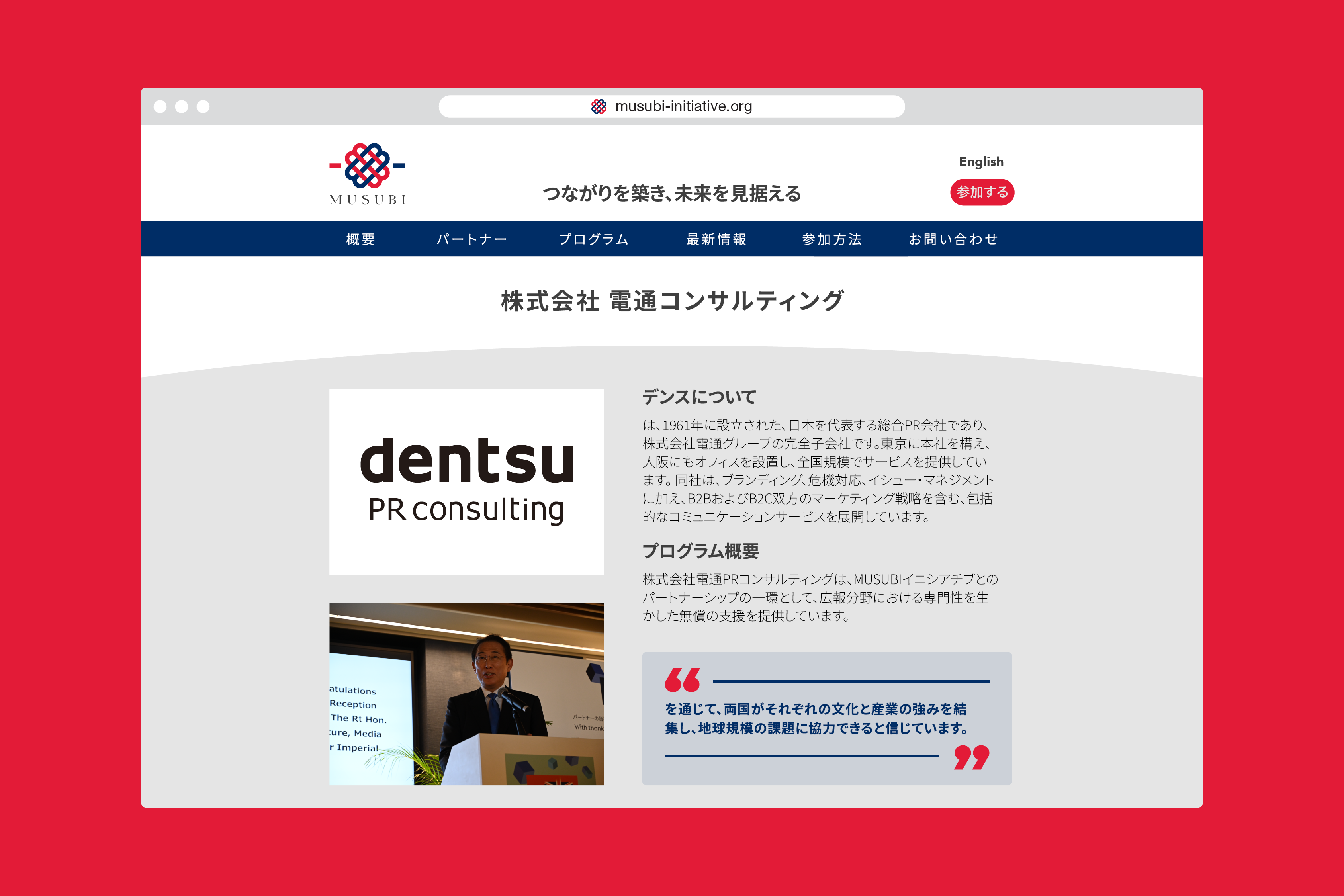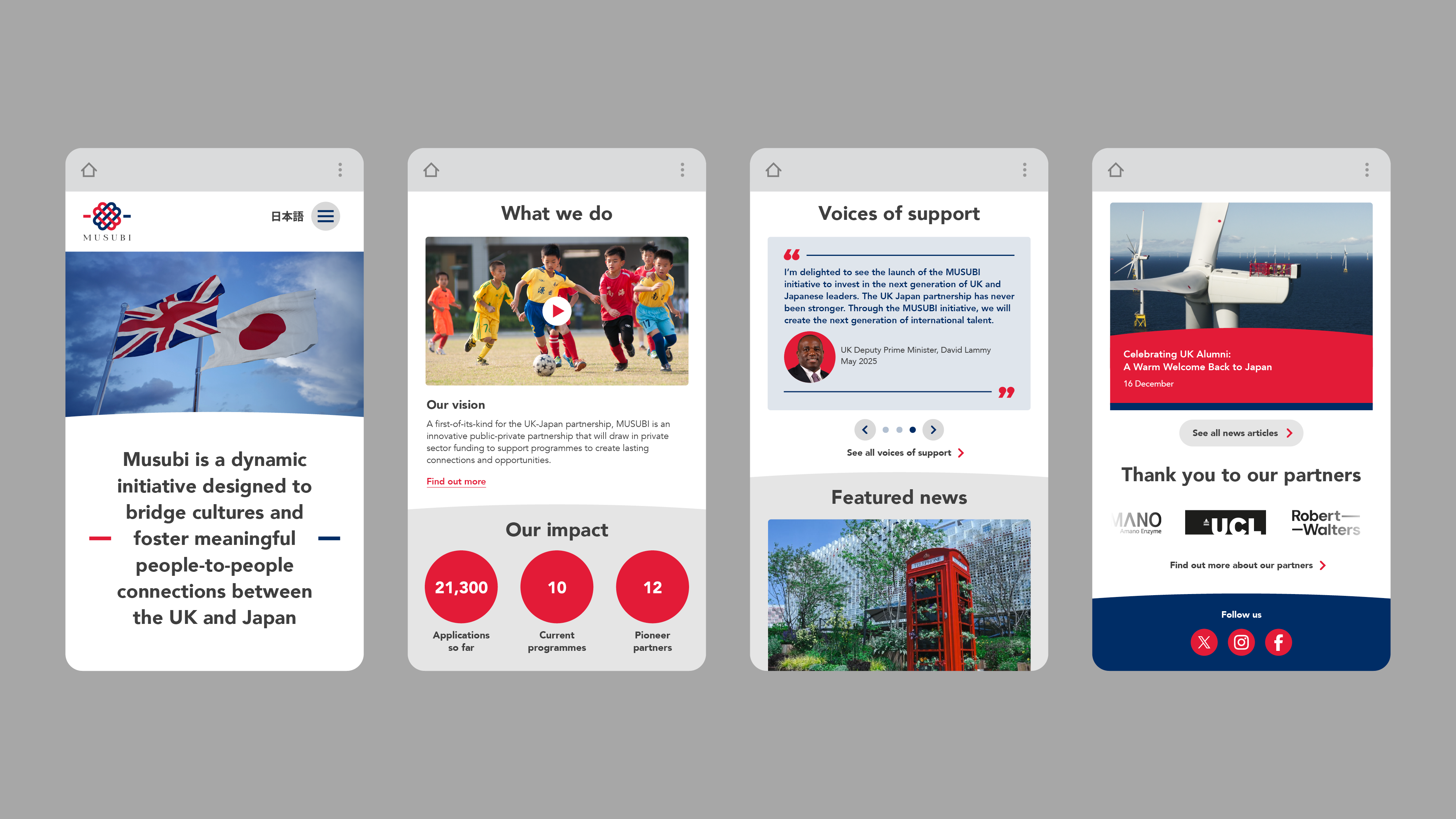 Musubi is a joint initiative between the UK and Japanese governments, which aims to build and connect the next generation of UK-Japan leaders. They tasked us with designing a website for them which looked credible and authoritative, and would work alongside their existing logo.